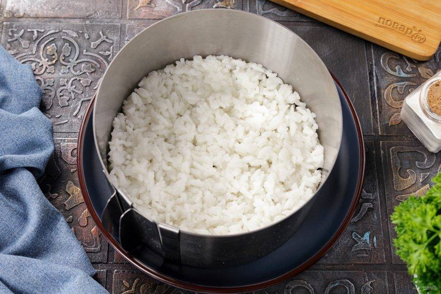 На плоское блюдо первым слоем выложите рис, я использую специальное кулинарное кольцо, но можно выложить слоями и просто так. Рис посолите и смажьте майонезом.