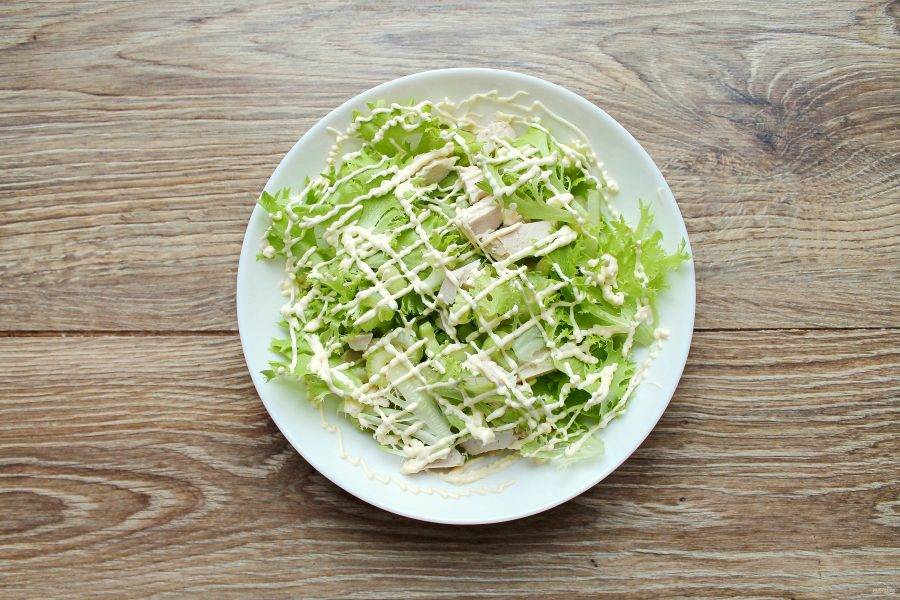 Стебли сельдерея порежьте на кусочки и выложите на курицу.