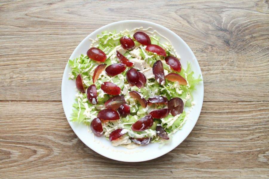 Ягоды винограда разрежьте пополам или на четыре части. Удалите зернышки и разложите поверх майонеза.