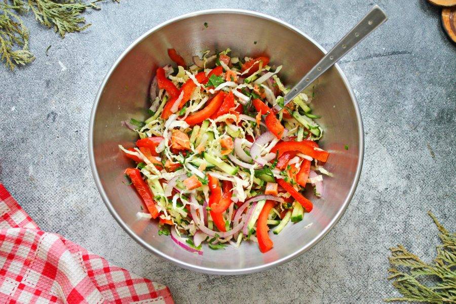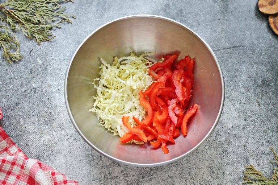 Листья пекинской капусты разрежьте вдоль на две части и порежьте соломкой. Болгарский перец разрежьте на четыре части и порежьте тонкой соломкой. Выложите овощи в салатник.