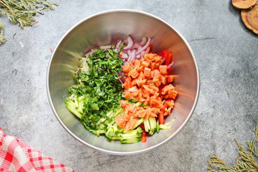 У слабосоленой семги удалите кожу, все косточки и порежьте кубиком. Зелень, у меня петрушка, мелко порежьте и вместе с рыбой выложите в салат.