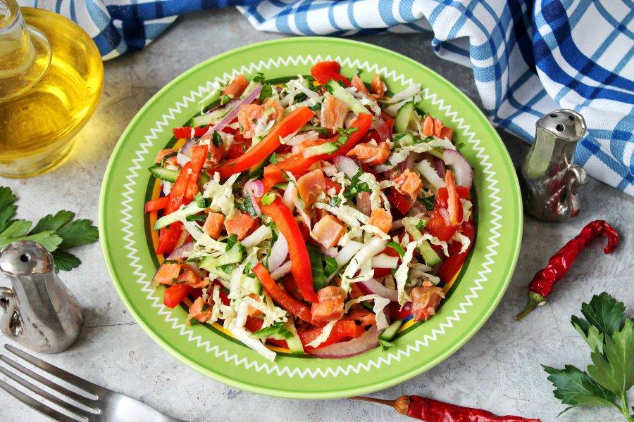 Простой, но очень вкусный салат, в котором много сочных овощей, а слабосоленая семга отлично их дополняет. Отличный вариант, чтобы подать салат на обед, легкий ужин и на праздничный стол. Берите идею!