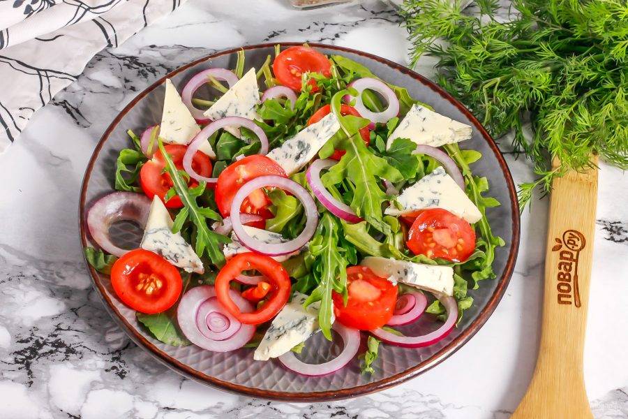 Красочный салат с рукколой и сыром с голубой плесенью идеально подойдет для легкого перекуса или ужина. Его можно подать с бокалом охлажденного белого вина, особенно — на романтический ужин любимым!