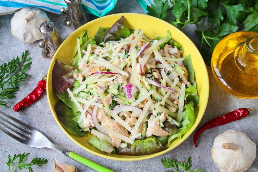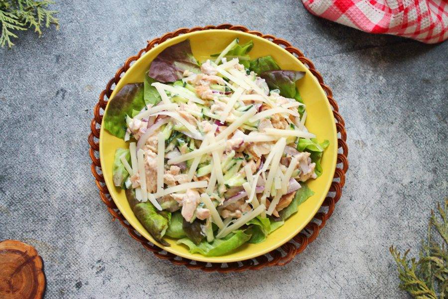 Сыр натрите на средней терке, посыпьте им салат сверху и подавайте к столу.