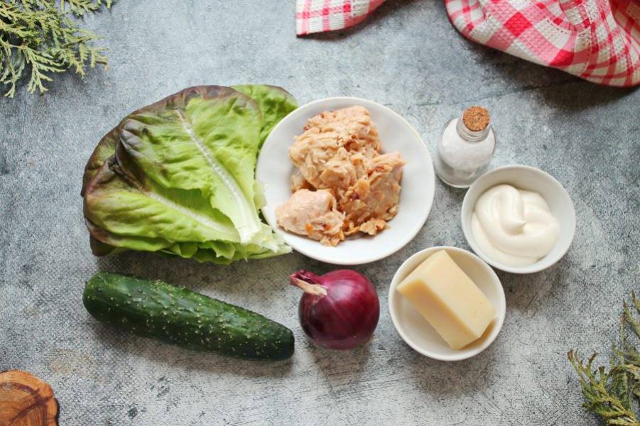 Подготовьте все необходимые ингредиенты для приготовления салата с сыром, огурцом и тунцом. Огурцы вымойте, красный лук почистите и сполосните.