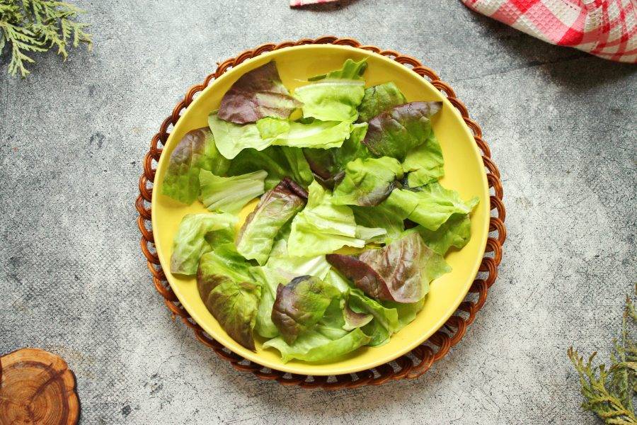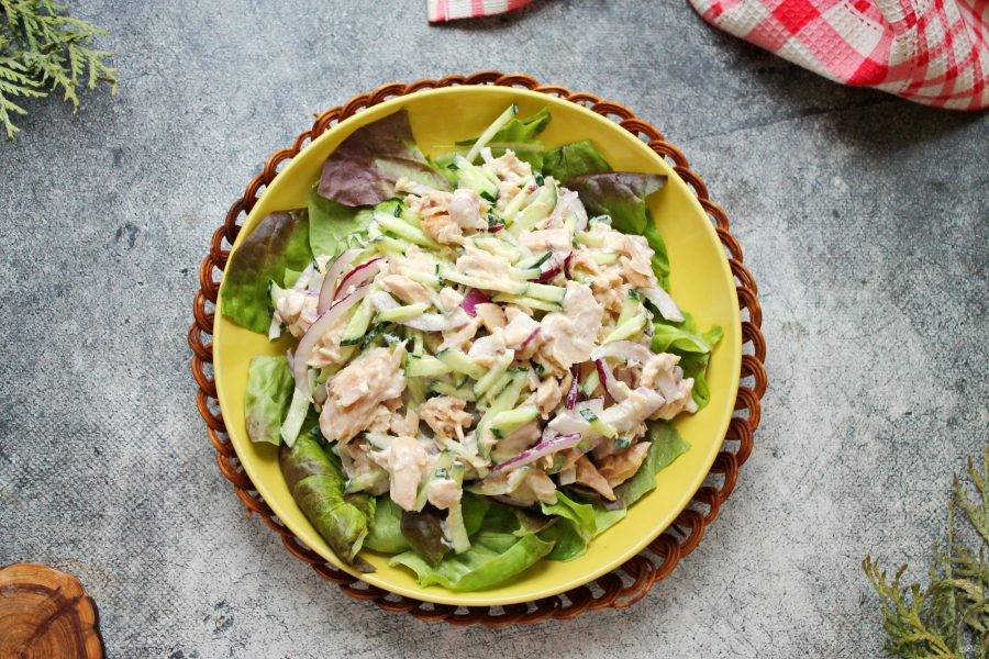 Салат заправьте майонезом, перемешайте и выложите в блюдо с салатными листьями.
