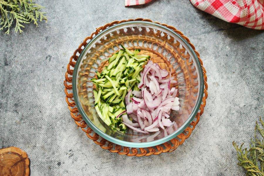 Свежие огурцы порежьте соломкой, красный лук полукольцами. Выложите овощи в салатник.