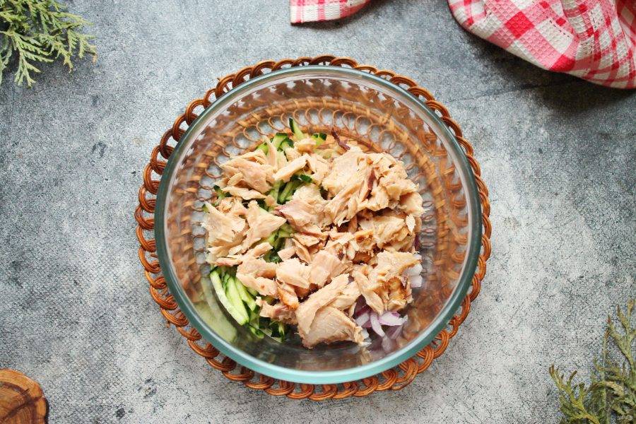 С тунца слейте жидкость и разомните вилкой и добавьте к овощам. Все посолите и перемешайте.
