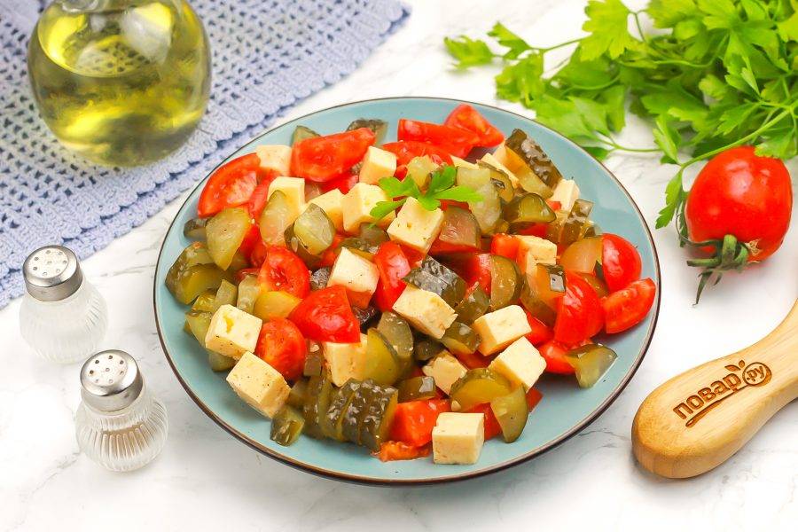 Поперчите салат и заправьте растительным маслом. Соль и уксус или лимонный сок добавлять не нужно — они с избытком есть в маринованных огурцах. Аккуратно все перемешайте и выложите на тарелку. Можно добавить измельченную свежую зелень. Приятного вам аппетита!