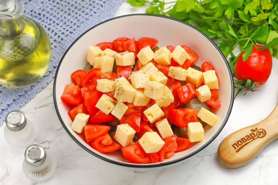 Твердый или рассольный сыр нарежьте кубиками и всыпьте в емкость к остальным ингредиентам.
