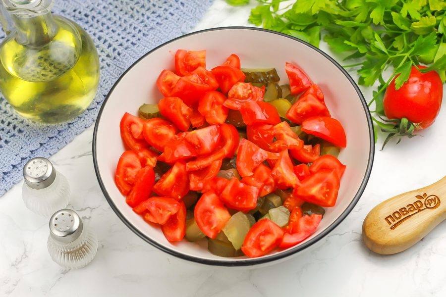 Промойте помидоры и вырежьте зеленые сердцевинки. Нарежьте небольшими ломтиками и добавьте в емкость к огурцам.