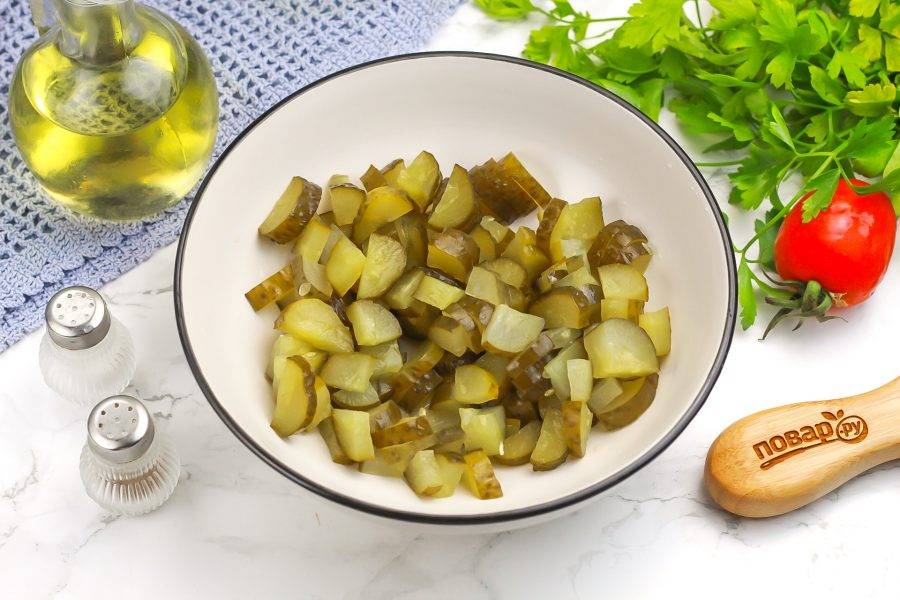 Первым делом нарежьте полукольцами или брусочками маринованные огурцы, срезая у них хвостики. Оставьте нарезку на 5-10 минут, чтобы выделился маринад. Затем слейте его и слегка отожмите всю нарезку. Если этого не сделать, то салат "поплывет".