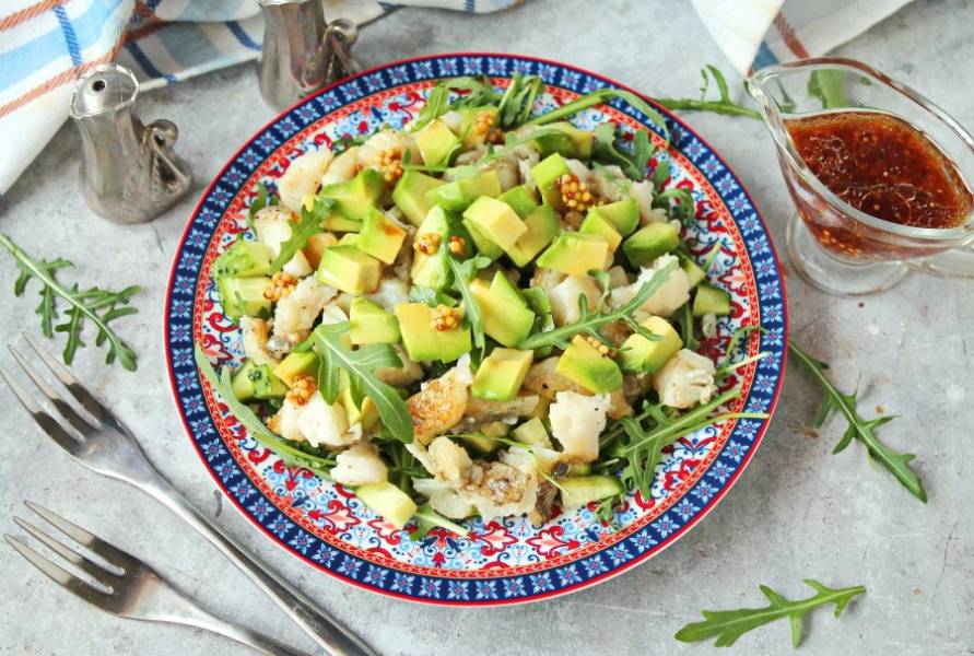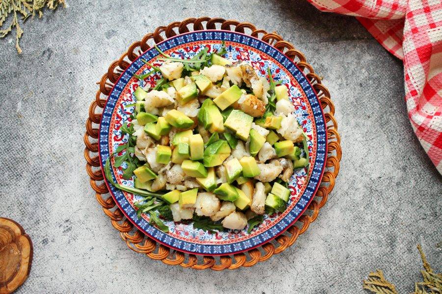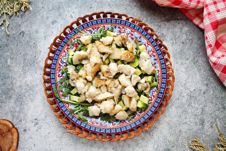 Остывшую, обжаренную треску выложите поверх огурца и рукколы.