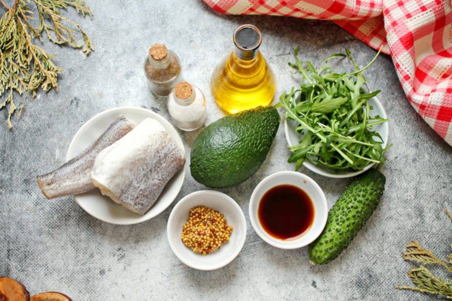 Подготовьте все необходимые ингредиенты для приготовления салата с треской и авокадо. Авокадо, зелень и огурец помойте и обсушите.