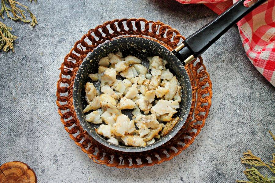 Треску промойте в холодной воде, обсушите бумажным полотенцем и сделайте филе. Удалите все косточки, порежьте средней соломкой, посолите и поперчите. В сковороду налейте половину растительного масла, разогрейте и выложите рыбу. Обжаривайте треску на среднем огне до золотистой корочки, примерно 4-6 минут, остудите.