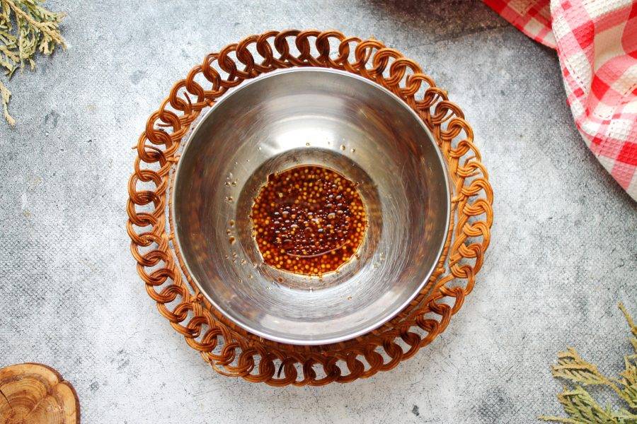 В миске смешайте оставшееся растительное масло, зерновую горчицу и соевый соус.