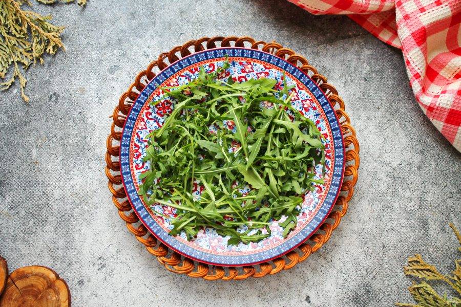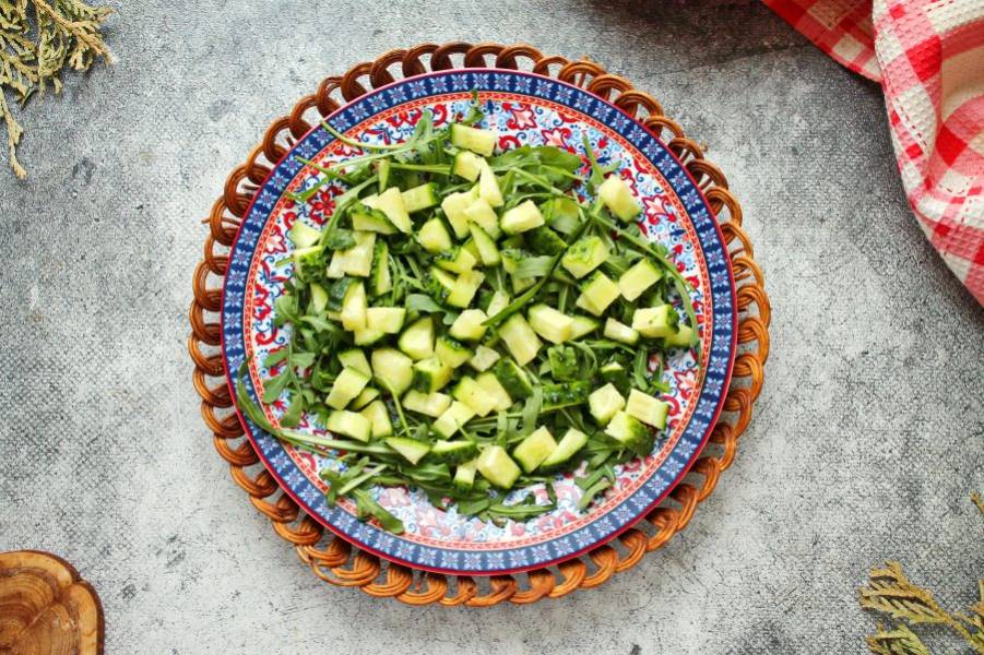 У свежего огурца отрежьте кончики и порежьте мелким кубиком, разложите поверх рукколы.