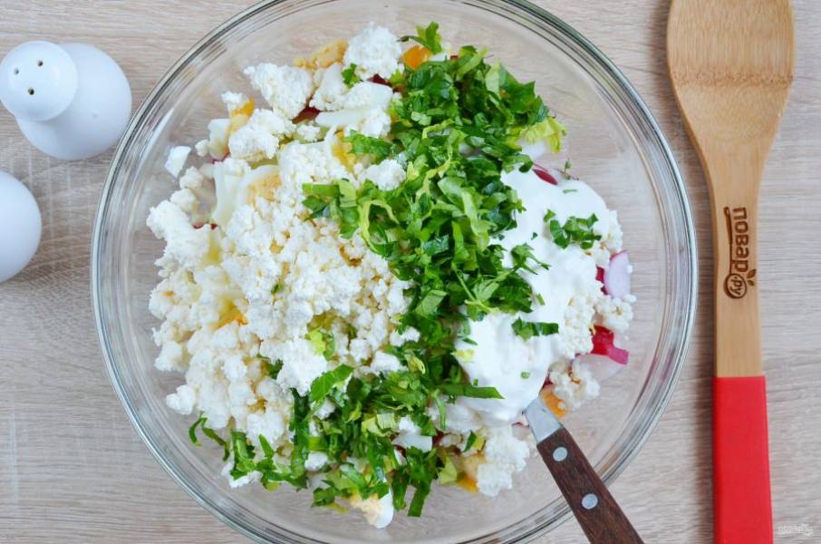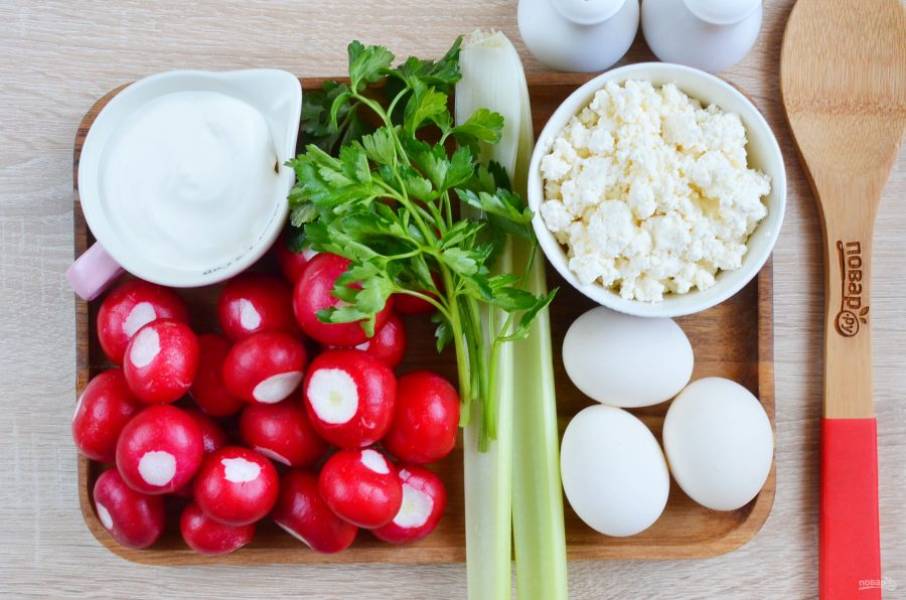 Подготовьте ингредиенты: редис, сельдерей, яйца, творог, сметану, зелень и специи. Приступим!