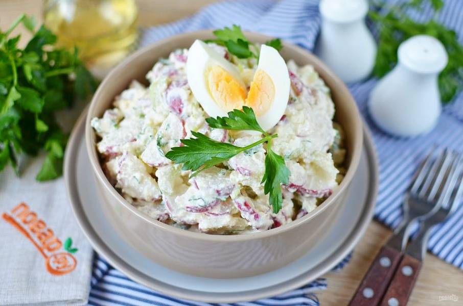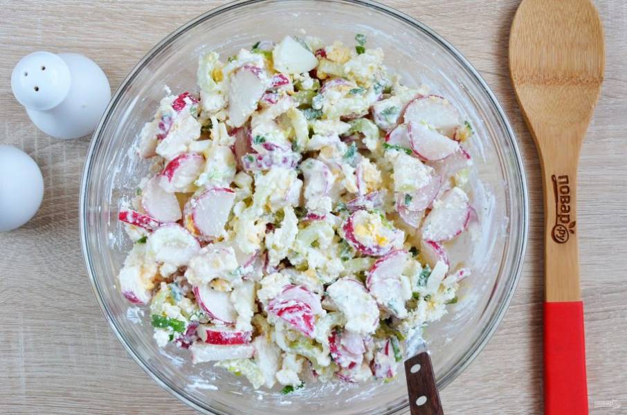 Перемешайте салат и подайте к столу. Хранить такой салат нельзя, редис дает много сока.