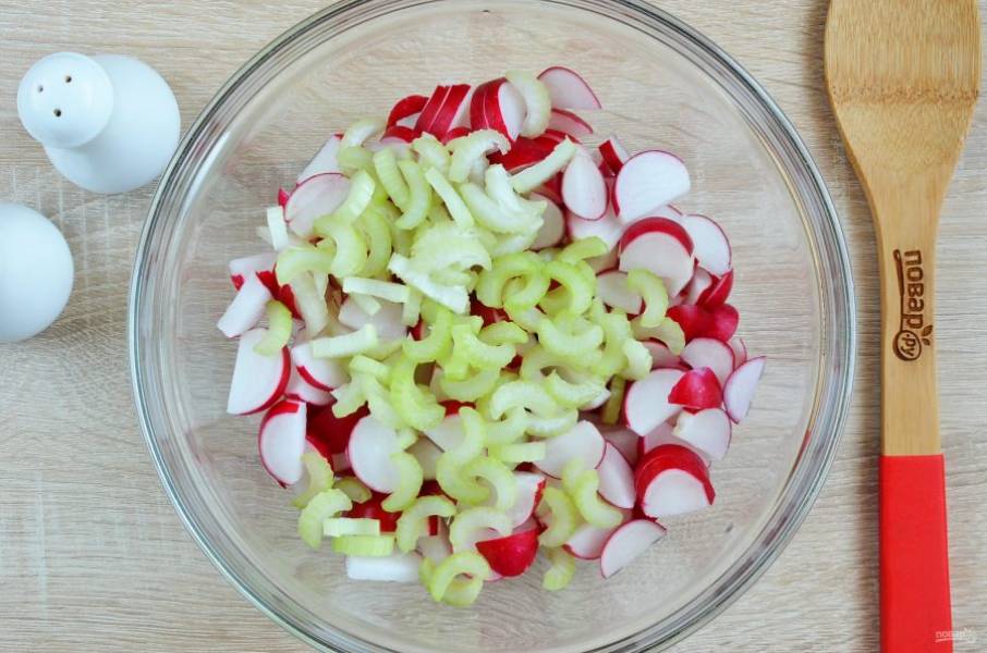 Сельдерей порежьте поперек стебля тонкими слайсами. Добавьте к редису.