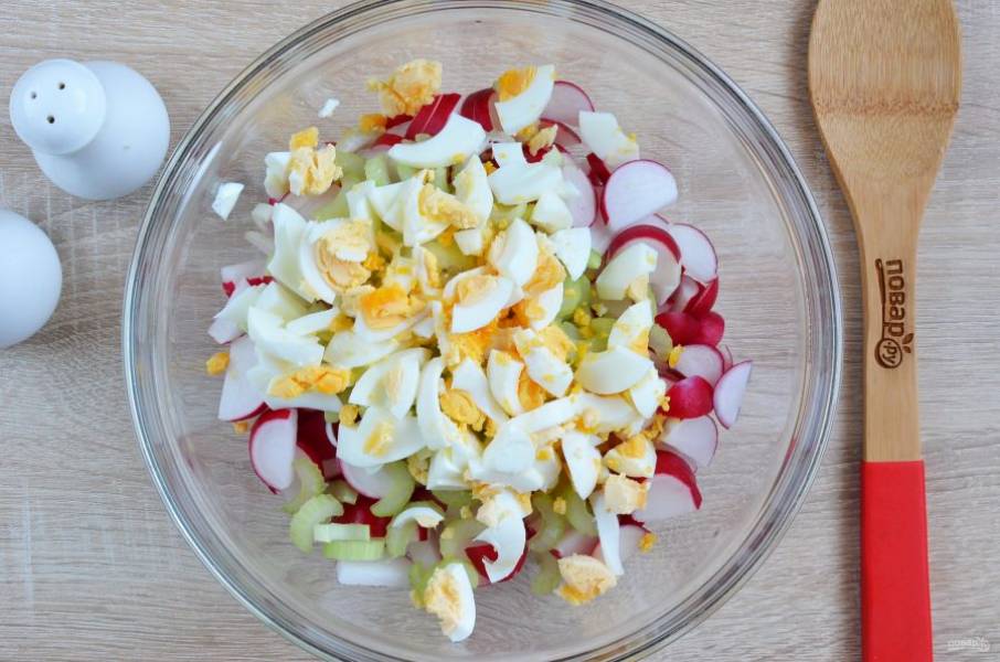 Яйца очистите от скорлупы, крупно порежьте и выложите в салатник к овощам.