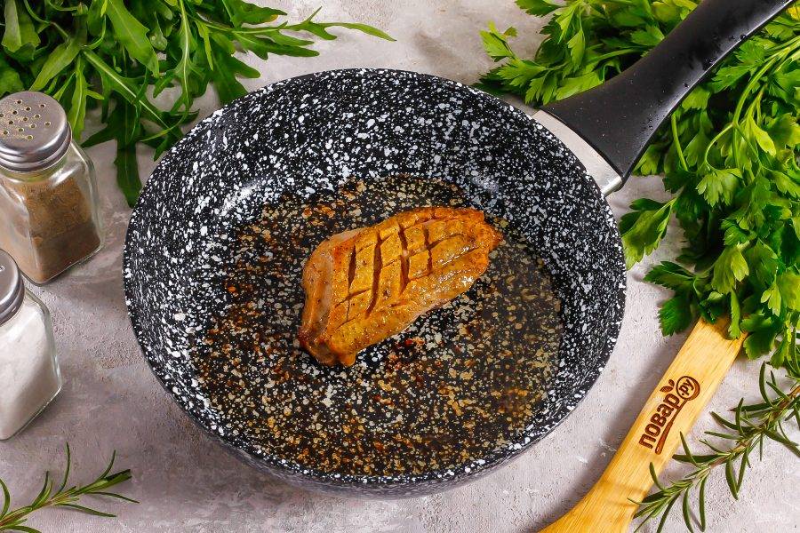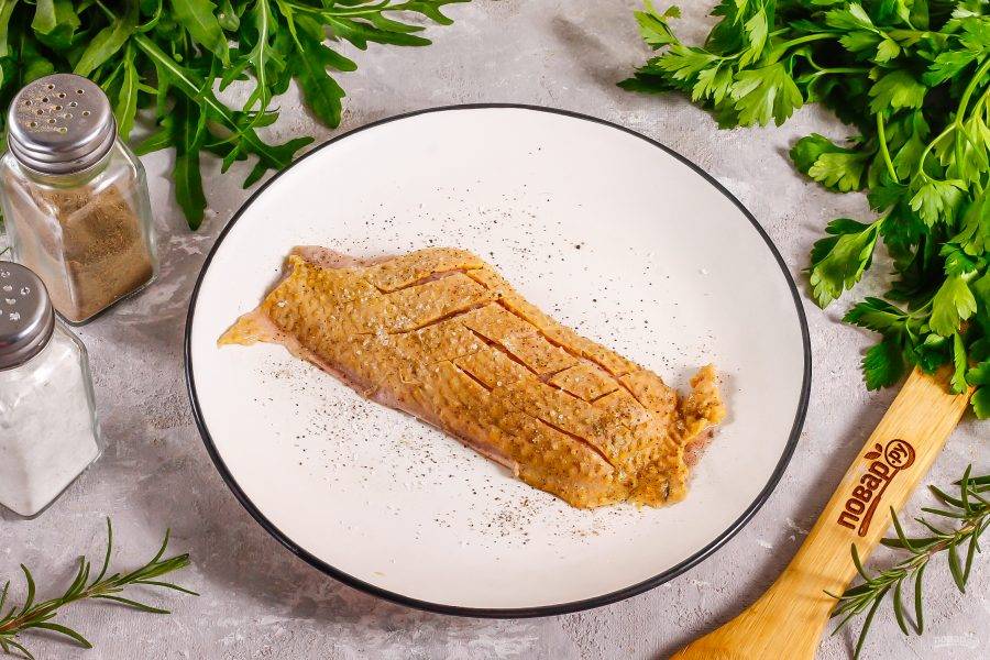Утиную грудку промойте и просушите бумажными салфетками. Острым ножом аккуратно нарежьте кожу полосками вдоль и поперек, не дорезая до мяса.