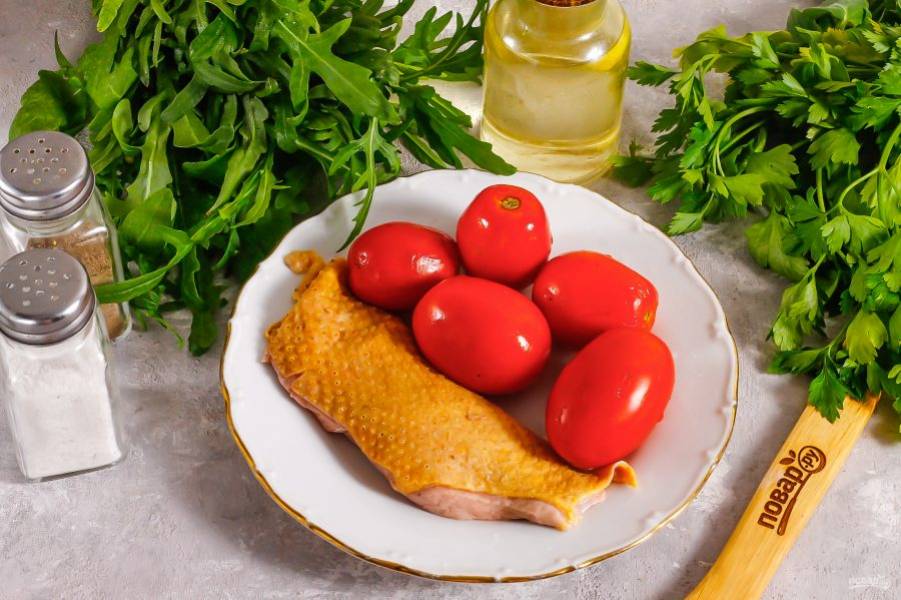 Утиную грудку извлеките из фольги и нарежьте слайсами. Выложите на тарелку. Посолите и поперчите, сбрызните маслом, оставшимся от жарки грудки.