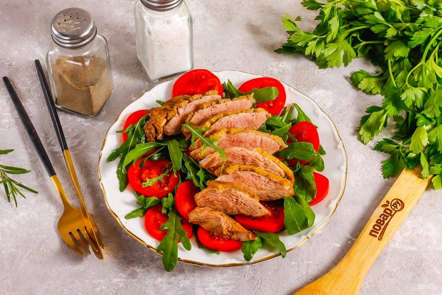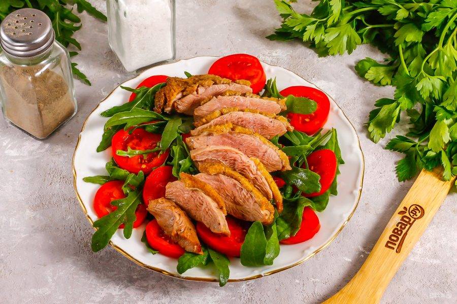 Подайте блюдо к столу сразу же после выкладывания нарезанной утиной грудки. Можно добавить немного ягод клюквы или смородины, малины.