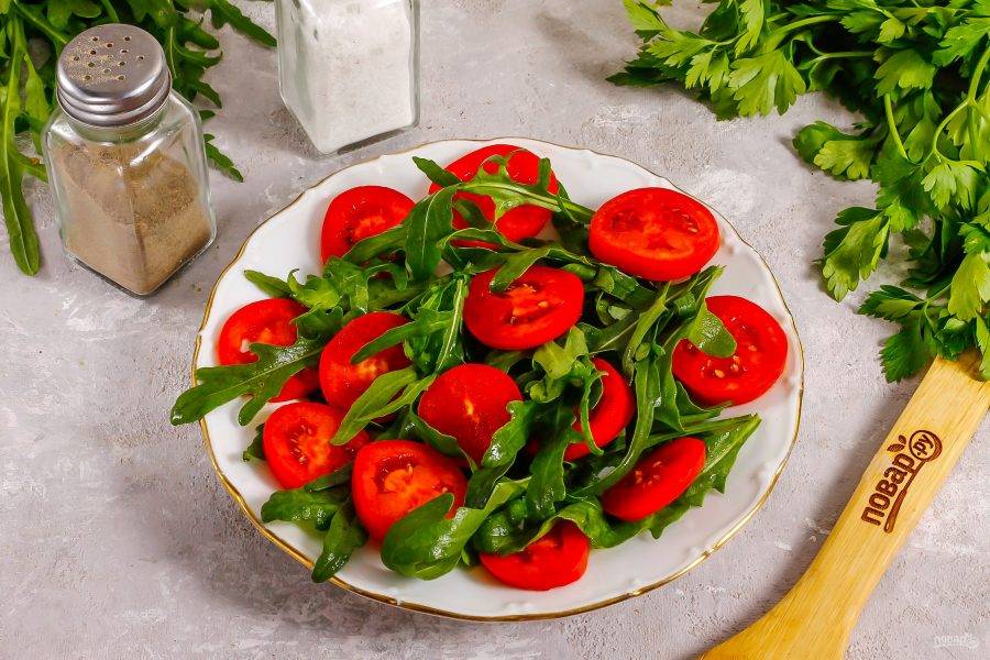 Помидоры промойте в воде, вырежьте из них зеленые сердцевинки и нарежьте кружочками. Выложите между листьев рукколы.