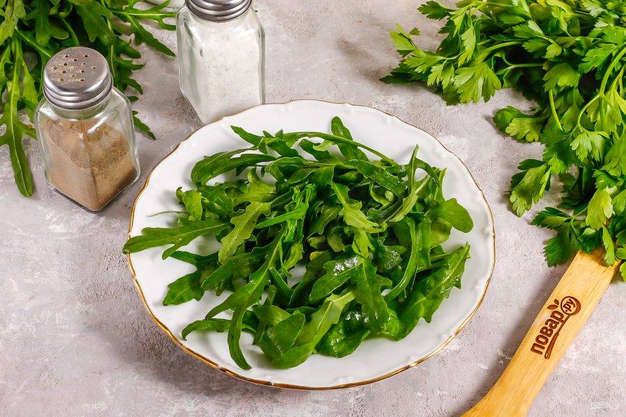 Рукколу промойте в воде, стряхните с листьев лишнюю влагу и выложите ее на тарелку.