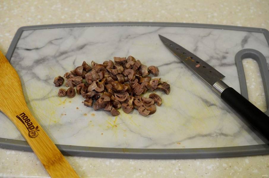 1. Сердечки отварите в течение 10 минут в подсоленной воде, затем нарежьте.