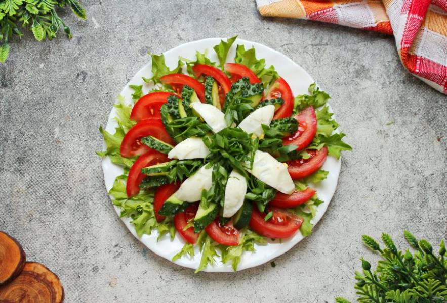 Помидор нарежьте дольками и выложите по кругу на листья салата.