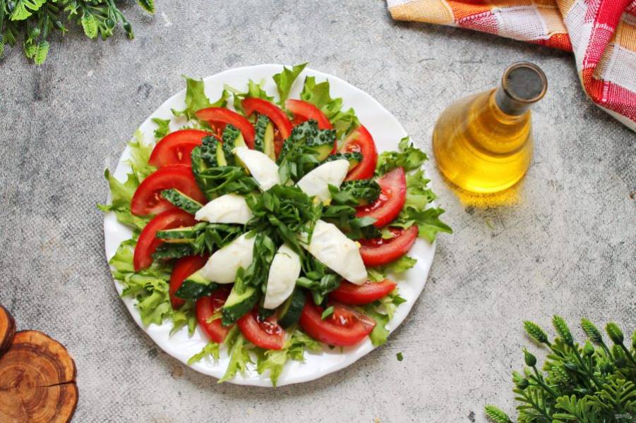 Салат заправьте маслом, посолите и подавайте к столу. Такой салат можно подать в более простом варианте. Просто порежьте все ингредиенты и смешайте в глубоком салатнике.