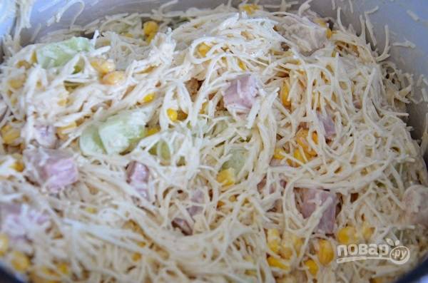 Салат "Кролик" с ветчиной, рисом, кукурузой и огурцом