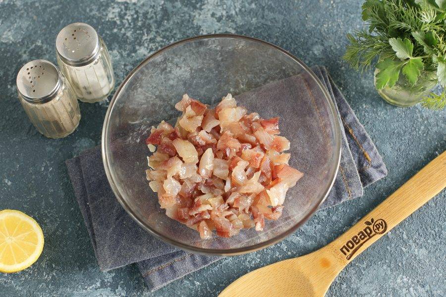 Рыбу разделайте на филе, нарежьте небольшими кубиками, переложите в салатник и полейте филе соком лимона. Если рыба суховата, то можно дополнительно сбрызнуть ее оливковым маслом.