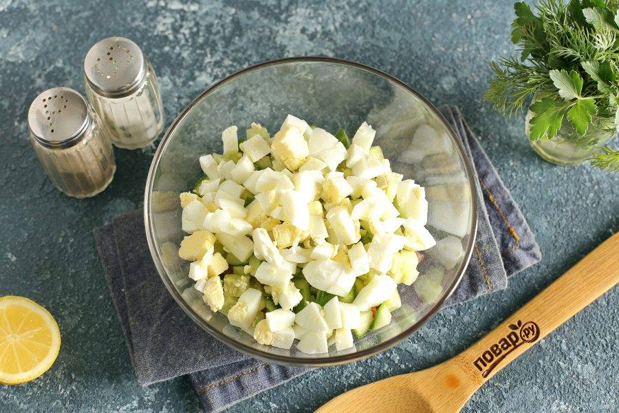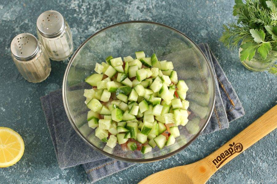 Добавьте нарезанный примерно такими же кубиками огурец.