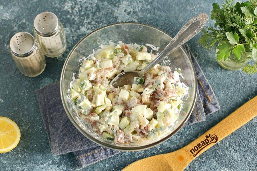 Хорошо все перемешайте. Салат с вяленой рыбой готов.