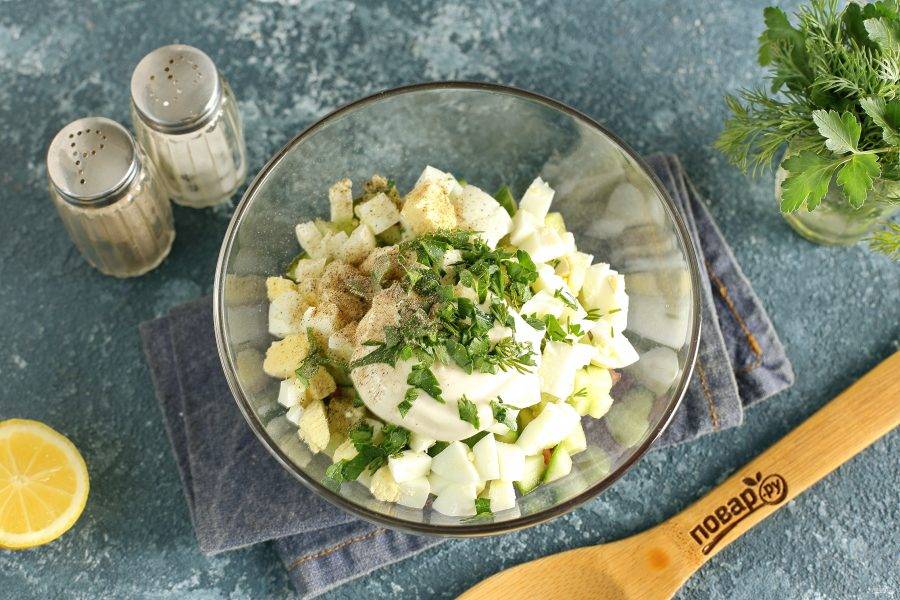 Салат посолите, поперчите, добавьте любую свежую зелень и майонез.