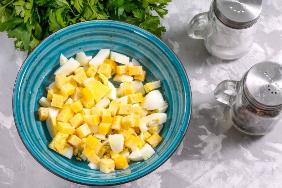 Заранее отварите и остудите куриные яйца. Очистите от скорлупы, промойте в воде и нарежьте кубиками. Всыпьте в миску или салатник.
