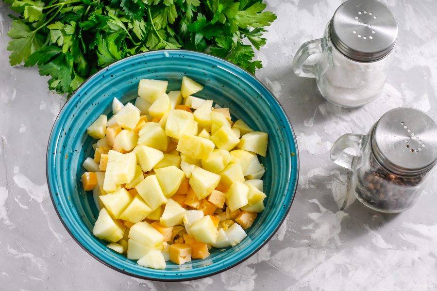 Твердый сыр любого, выбранного вами сорта, нарежьте средними по размеру кубиками и добавьте в емкость к отварным куриным яйцам.
