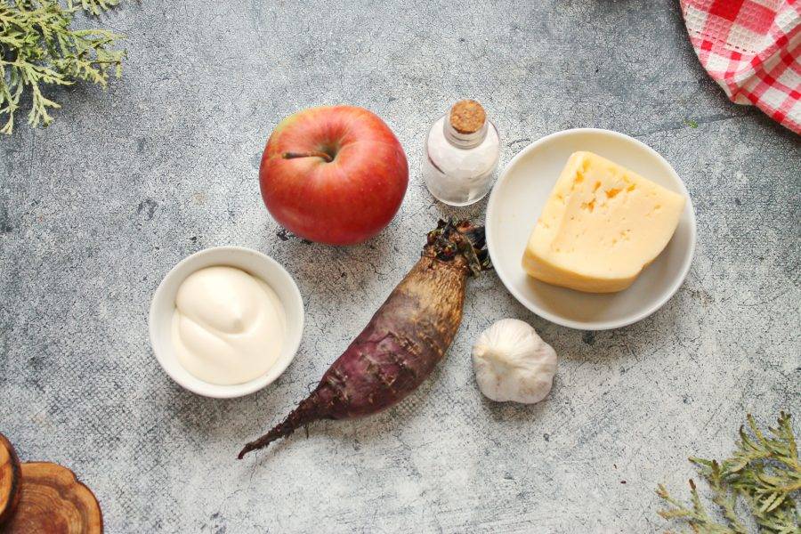 Подготовьте все необходимые ингредиенты для приготовления салата с яблоком, свеклой и сыром. Яблоко и свеклу вымойте и обсушите.