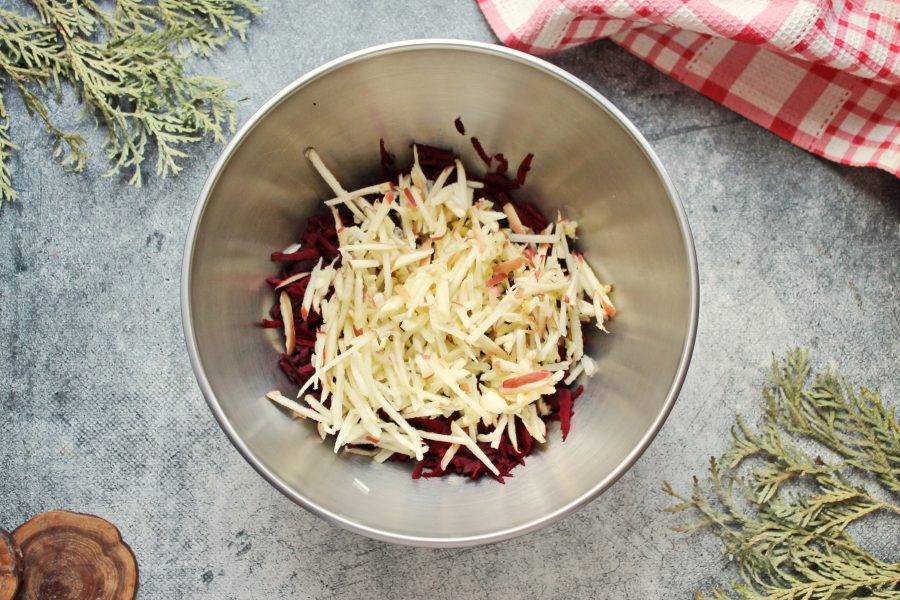 Яблоко разрежьте пополам, удалите сердцевину и натрите на терке для корейской моркови или нарежьте тонкой соломкой. Добавьте яблоко в свеклу.