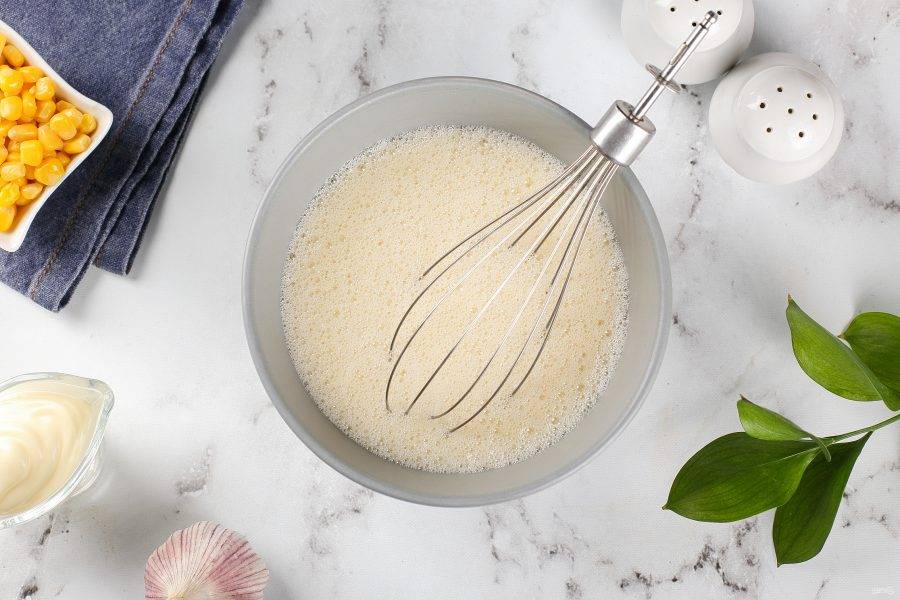 Соедините яйца, воду и крахмал. Посолите и поперчите по вкусу. Взбейте до однородного состояния.