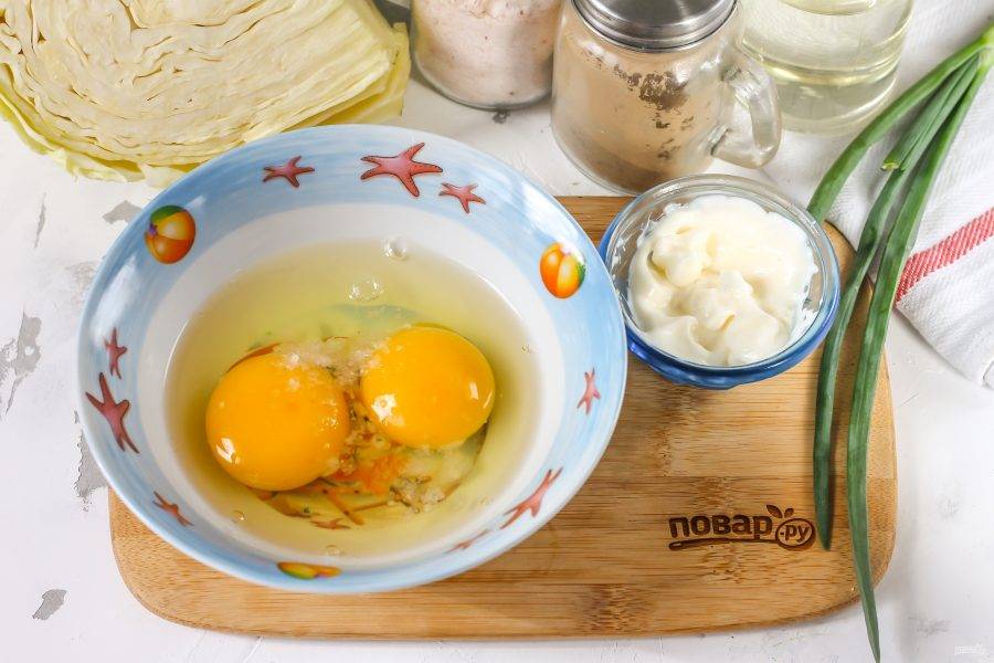 Куриные яйца вбейте в глубокую емкость, посолите и взбейте.