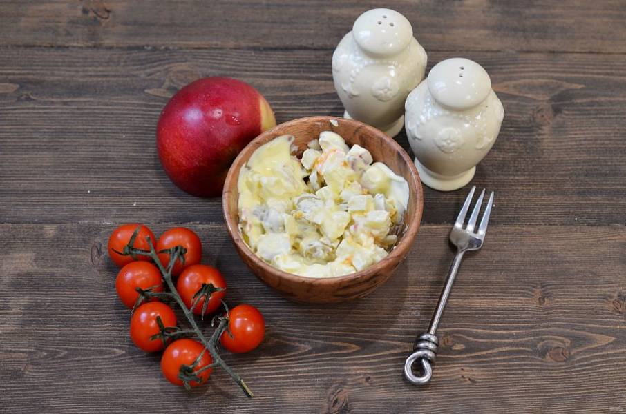 Рецепт приготовления салата из вареного картофеля, вареной моркови, репчатого лука, яблок, орехов и майонеза. Салат с яблоками не только вкусный, но и полезный.