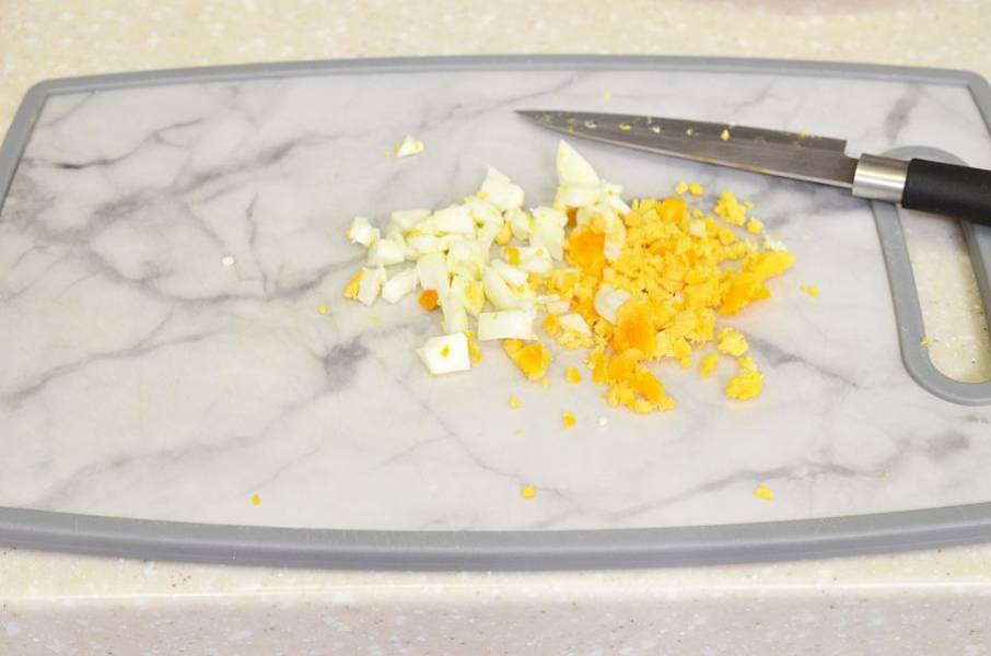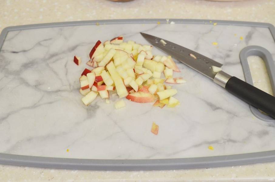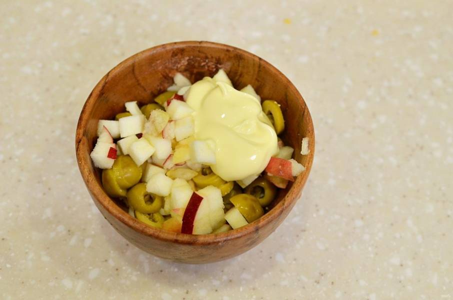 Рецепт приготовления салата из куриного филе, вареных яиц, яблок, лука, сыра, грецких орехов и майонеза.
