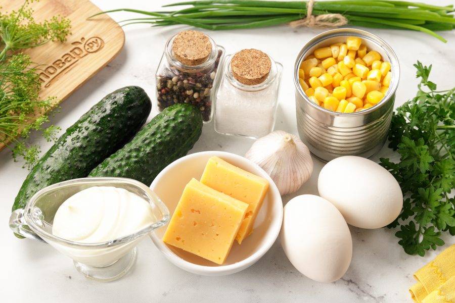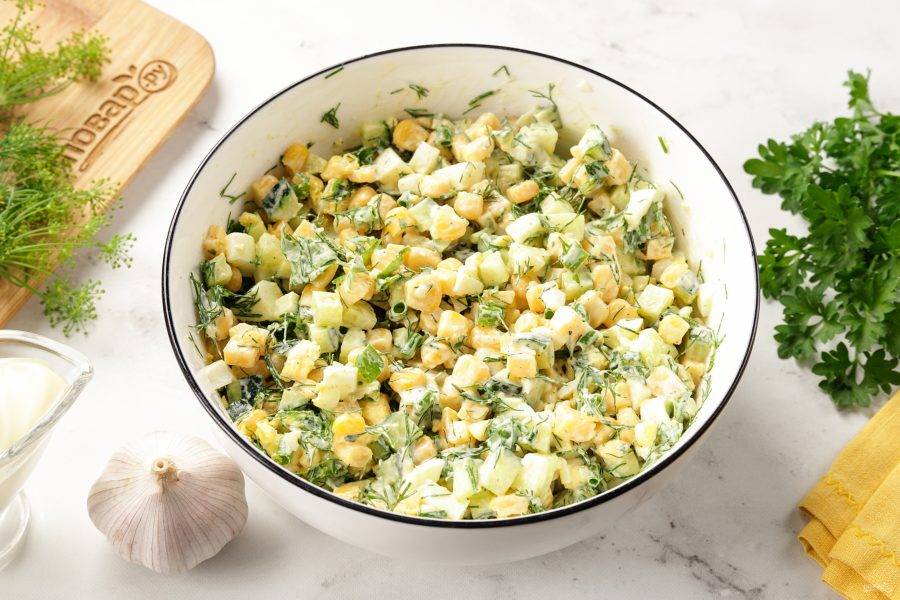 Хорошо перемешайте. Салат с яйцом, сыром, кукурузой и огурцом готов.