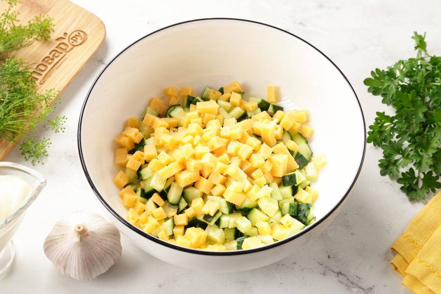 Огурцы нарежьте кубиками и переложите в глубокую миску или сразу в салатник.