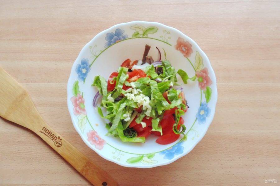 Салатный лист помойте и порвите руками на небольшие кусочки или нарежьте. Добавьте нарезанный чеснок.
