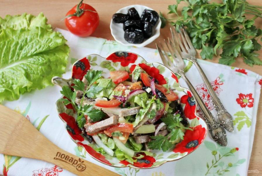 Салат с языком и черносливом готов. Подавайте на закуску.